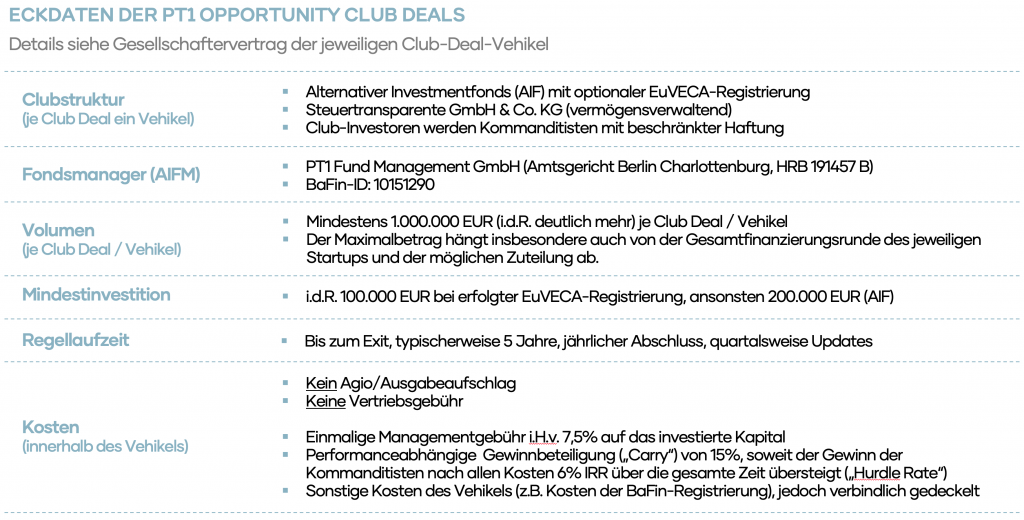 - PT1 Opportunity Club Deals stehen allen PT1-Fonds-Investoren sowie externen Investoren offen, die daran interessiert sind, Deal für Deal in ausgewählte Startups zu investieren (d.h. kein Blind Pool).